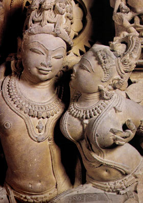 (Cet aspect a déjà été abordé à la page 53 du site : Dans la comparaison des mythes érotiques de l'Inde avec ceux de l'Occident, Marguerite Yourcenar souligne combien la volupté est librement déployée ici, tandis que là elle est toujours frappée de dramatique - Krishna parmi les bergères, contre Dyonisos, Orphée, le Bon Pasteur, etc. Dans cette comparaison, on mesure aussi combien en Inde la volupté se trouve mieux rendue, ressentie et transmise par la sculpture que par d'autres formes d'art ; là où l'auteur remarque que "plus s'est développée dans l'art une sensibilité proprement hindoue, plus l'érotisme s'est installé dans l'expression des formes"...)