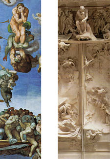 J'ajoute que dans ces deux cas, c'est le Christ qui est la figure centrale du Jugement, soit le Seigneur trônant au tympan de la cathédrale, soit le colosse nu dans les airs à la Sixtine, en sachant d'une part la faveur des cathédrales chez Rodin, mais en constatant d'autre part, côté Sixtine, que la figure du Christ a été remplacée par celle du 'Désespéré'. De toutes les manières, la laïcisation du modèle, l'évolution de l'emprunt est terriblement perverse.
