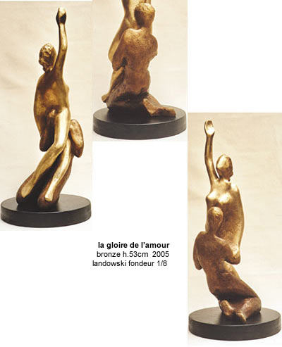 Quant à ma sculpture, là maintenant, il me revient de correspondre à l'attente d'une femme et d'un homme qui souhaitent marquer leur quarantième anniversaire de mariage par un bronze. On m'a donné une photo de la tombe de Bartholdi au cimetière Montparnasse : une femme-ange soulevée sur une haute stèle. Elle a quelque chose de la Liberté américaine et de la force du Lion de Belfort.